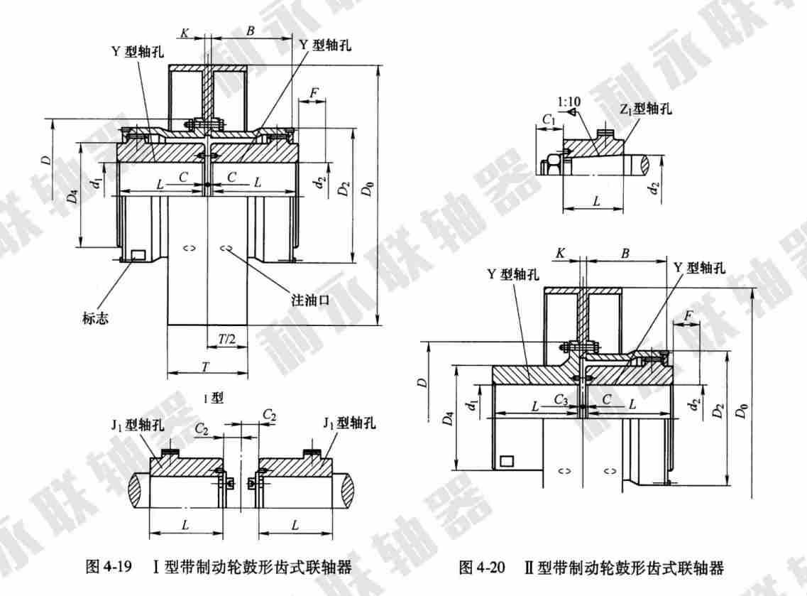 ●齒式聯軸器在工作時,兩軸產生相對角位移,內外齒的齒面周期性作軸向相對滑動,必然形成齒面磨損和功率消耗,因此,齒式聯軸器需在有良好和密封的狀態下工作。齒式聯軸器徑向尺寸小,承載能力大,常用于低速重載工況條件的軸系傳動, 并經動平衡的齒式聯軸器可用于高速傳動,如燃汽輪機的軸系傳動。由于鼓形齒式聯軸器角向補償大于直齒式聯軸器, 均廣泛采用鼓形齒式聯軸器,直齒式聯軸器屬于被淘汰的產品,選用者應盡量不選用。